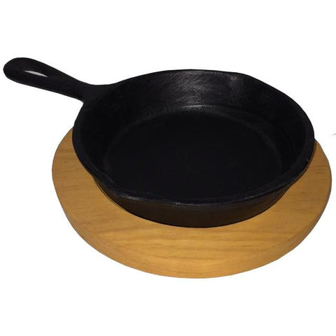 Sartén sin tapa con mango de fierro vaciado, incluye base de madera. Medida sin mango 23cm diámetro x 5cm