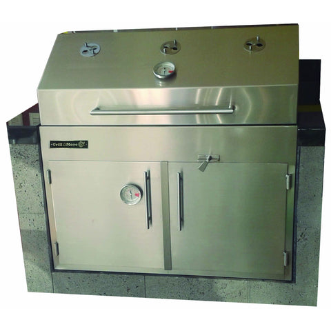 Asador y Ataúd fabricado en acero inoxidable T 304, Solo charola carbonera en acero al carbón, Puede ser versión empotrable o versión móvil adquiriendo el carro por separado (ver en accesorios Carro para GMA), Asador estilo Argentino con parrilla de ángulos con sistema de elevación y grasera desmontable, Ataúd aislado con puerta solidas de acero inoxidable, 1 Termómetro en puerta de Ataúd, En Interior cuenta con 2 parrillas de varilla deslizables y 1 charola para grasa, Medida de Parrilla para alimentos 86cm x 50cm, Medida exterior de Ataúd 91.5cm largo x 58cm ancho x 59cm alto, Medidas de hueco en obra terminada 92cm largo x 58.5cm ancho x 59cm alto